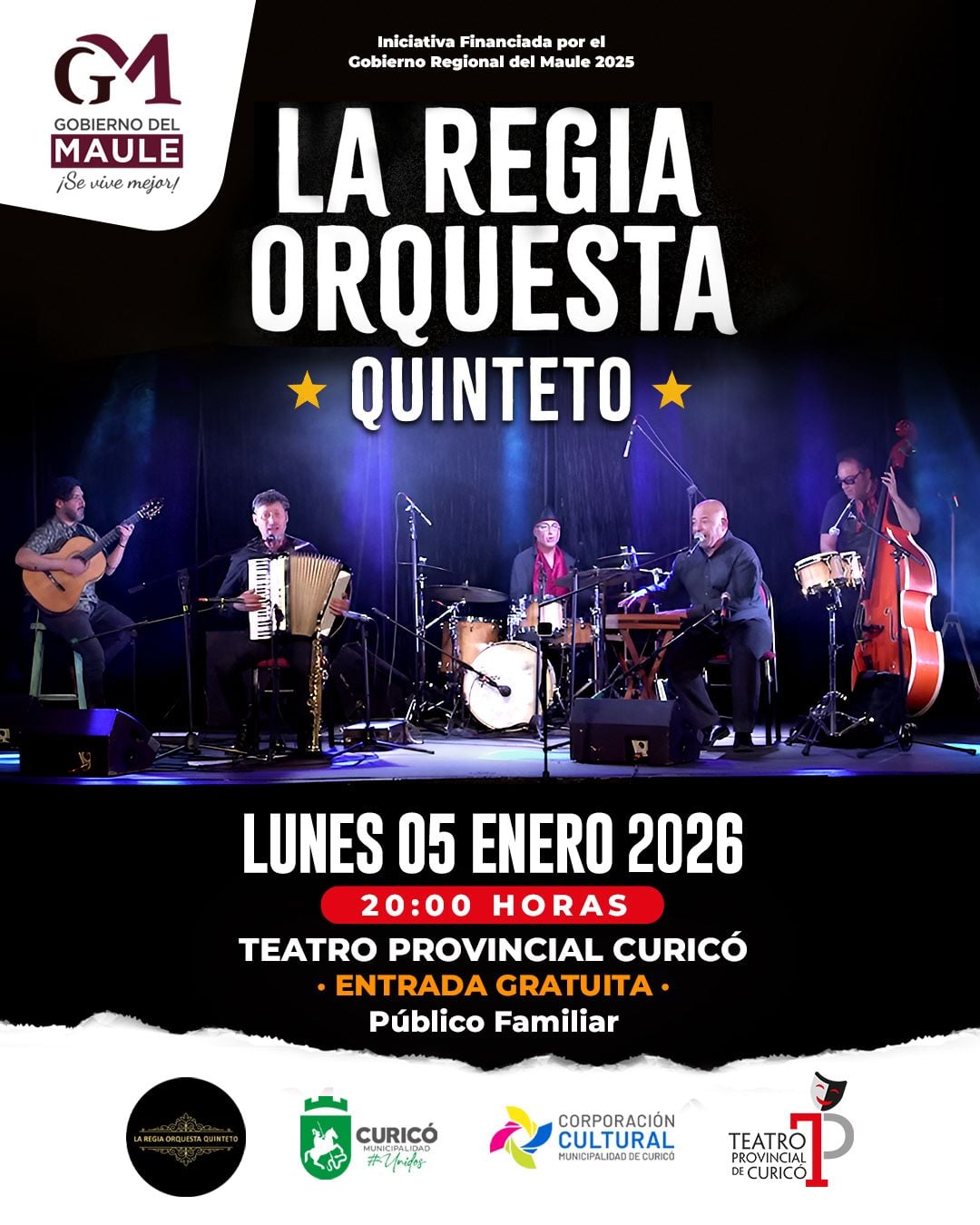 La Municipalidad de Curicó, a través de su Corporación Cultural y el Teatro Provincial, dará el vamos a la programación artística del verano 2026 con un espectáculo de primer nivel. Se trata de la presentación de la “Regia Orquesta Quinteto”, banda nacional que revivirá la música del recuerdo y los emblemáticos sones de la obra teatral "La Negra Ester".
