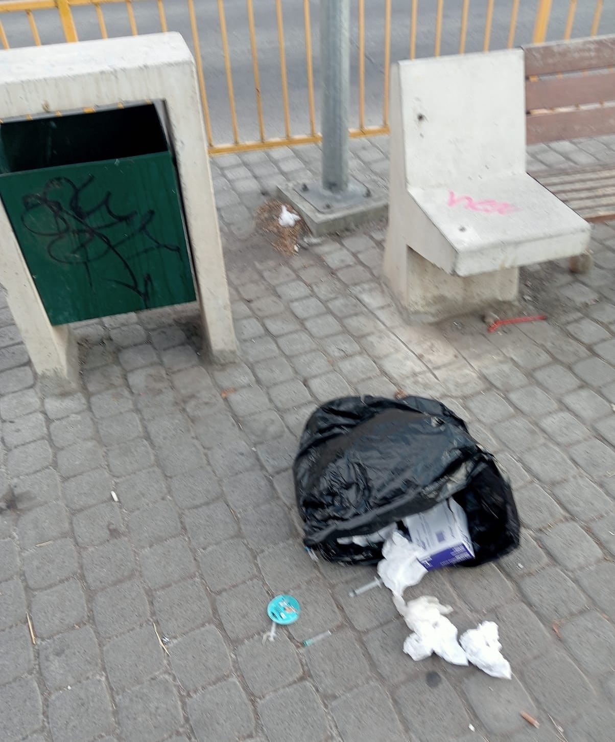 Las imágenes enviadas a nuestro departamento de prensa evidencian el peligro al que se expuso a la comunidad, mostrando jeringas usadas, guantes de procedimiento, gasas con fluidos y cajas de insumos médicos diseminados sobre los adoquines. Este tipo de material representa un foco infeccioso y un peligro latente tanto para peatones como para el personal encargado del aseo urbano.