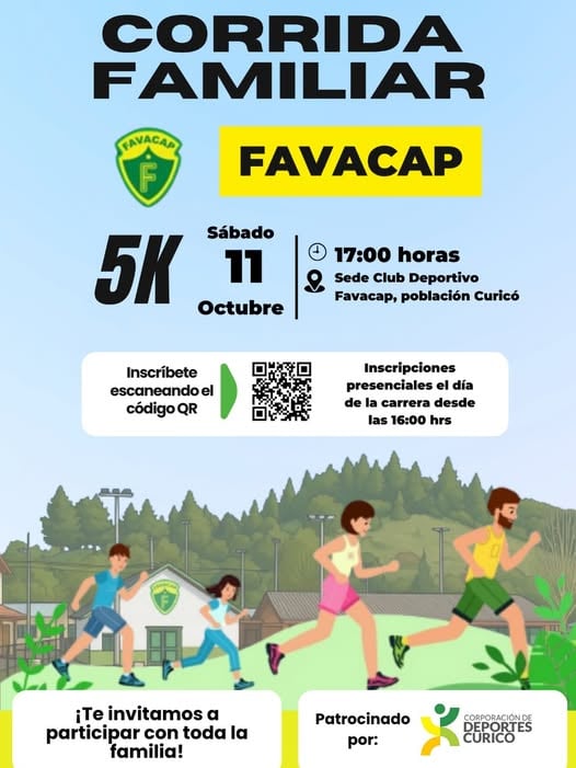 El evento se realizará este sábado 11 de octubre, teniendo como punto de largada la Sede del Club Deportivo Favacap, ubicada en la Población Curicó. La actividad es gratuita y abierta a todo público, invitando a vecinos y vecinas de todas las edades a ser parte de esta fiesta deportiva.