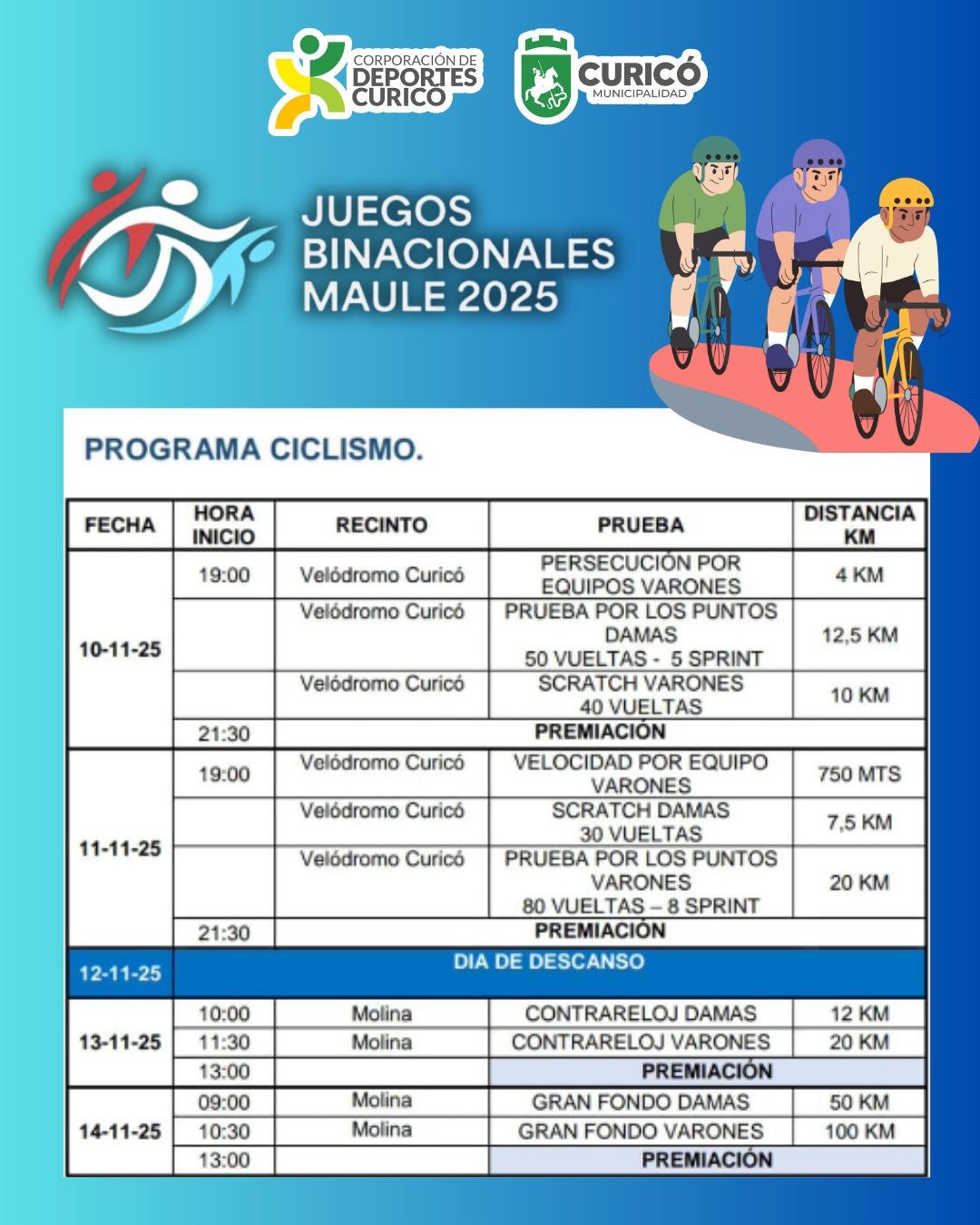 Mientras que el ciclismo se realizará en el reinaugurado velódromo “Manuel Gallardo”, en sus primeras competiciones, los días lunes 10 y martes 11, de 19 a 21 horas. Cabe destacar que mayores detalles de las competencias estarán en las redes sociales de la Municipalidad de Curicó, de la corporación de deporte y del IND.