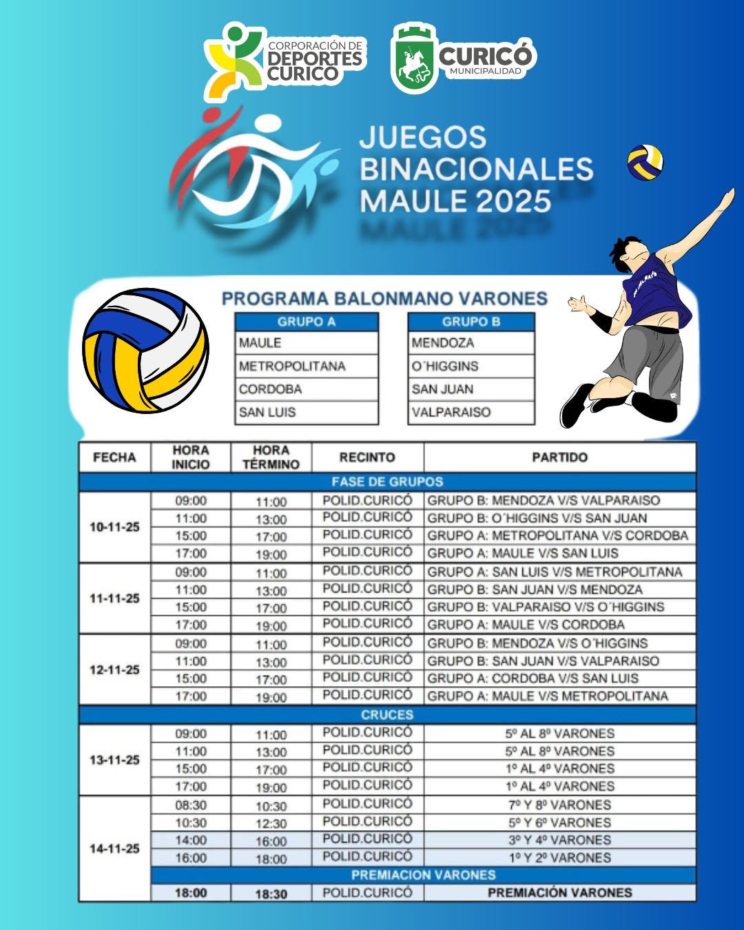 Cabe destacar que en Curicó se realizará el balonmano y el ciclismo. Justamente, el calendario del balonmano varones será, del 10 al 14 de noviembre, de 9 a 19 horas, todos los días, en el polideportivo de Curicó.