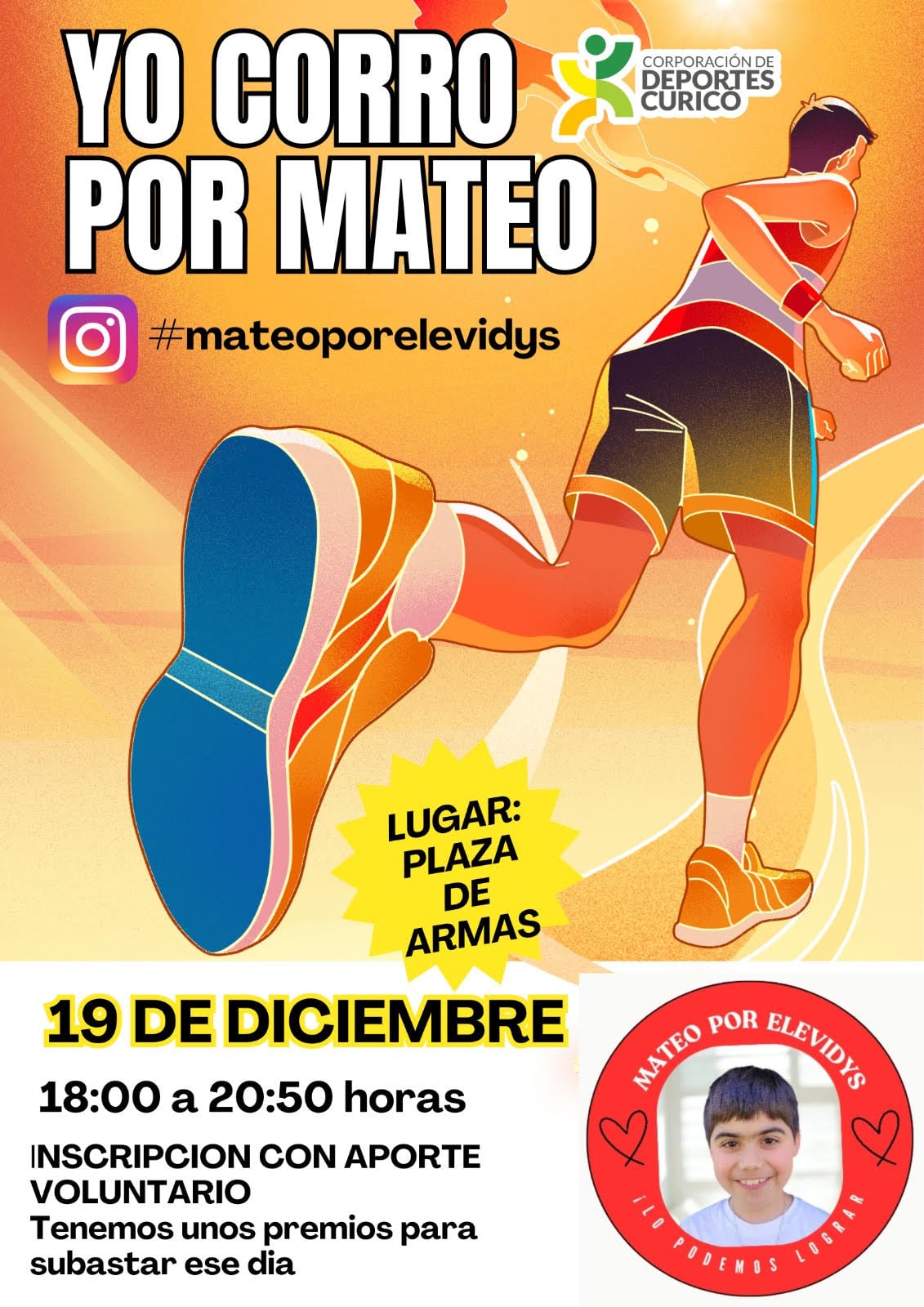 Este viernes 19 de diciembre, entre las 18:00 y 20:50 horas, la plaza de armas de Curicó será el punto de encuentro de la gran corrida solidaria “Yo Corro por Mateo”.