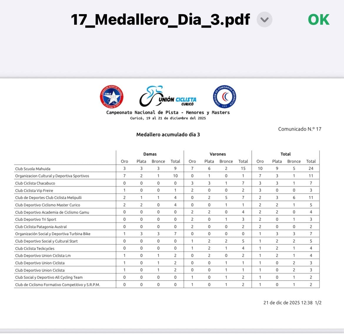 El cierre del Campeonato Nacional de Pista 2025 no pudo ser más exitoso para el ciclismo curicano. La Bici Scuola Mahuida se alzó con el título del mejor equipo del torneo tras una actuación arrolladora durante las tres jornadas de competencia en el velódromo Manuel Gallardo.