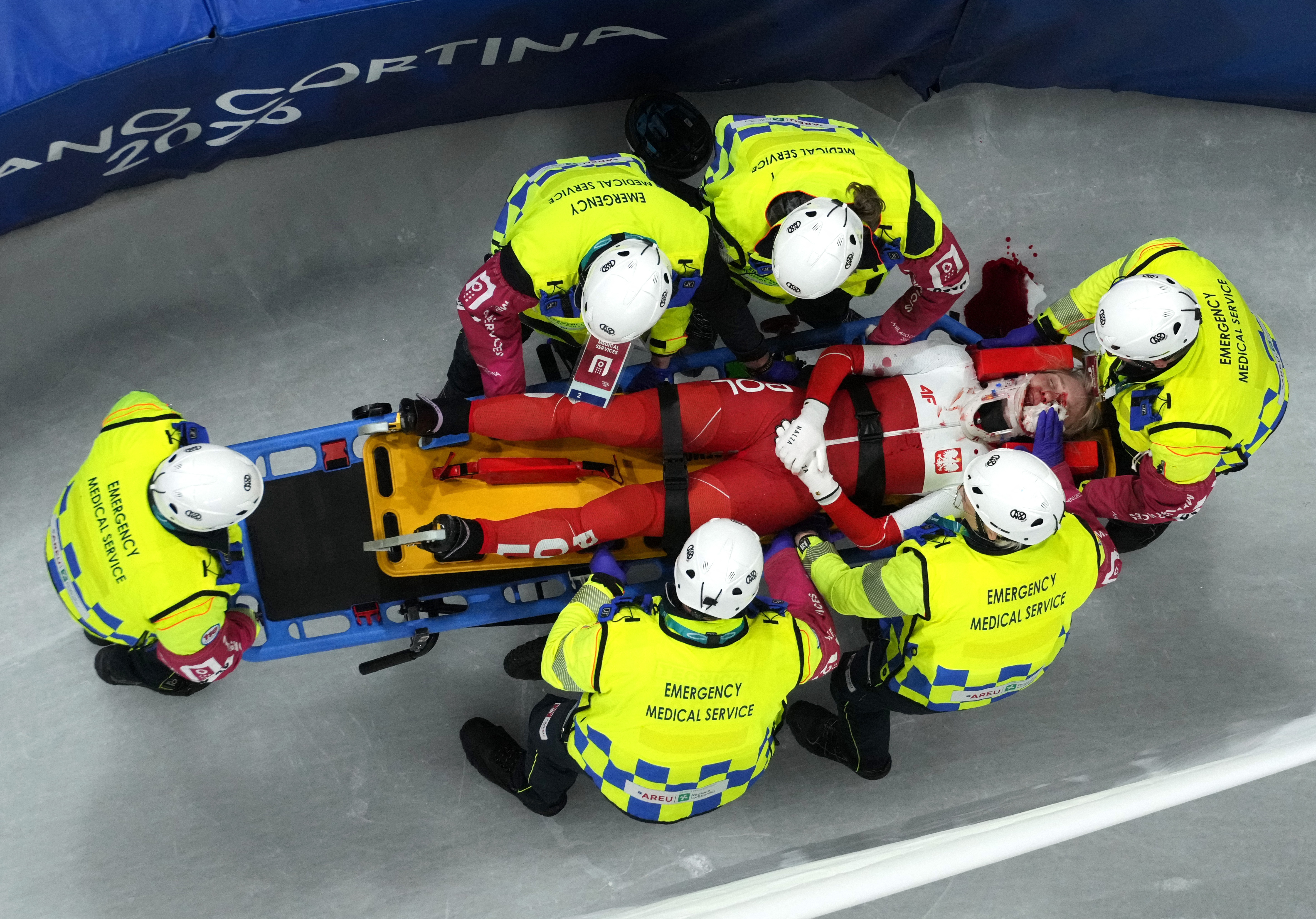Milano Cortina 2026 Olympics - Short Track Speed Skating - Women's 1500m - Quarterfinals - Milano Ice Skating Arena, Milan, Italy - February 20, 2026. Kamila Sellier of Poland is placed on a stretcher after sustaining an injury during quarter final 6 REUTERS/Fabrizio Bensch