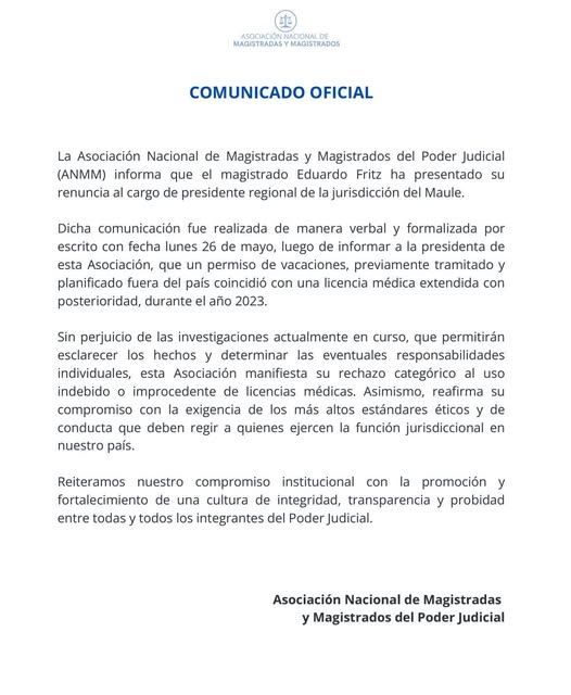 El juez Eduardo Fritz ha renunciado a la presidencia regional de la Asociación Nacional de Magistrados del Poder Judicial del Maule, luego de reconocer un mal uso de una licencia médica.