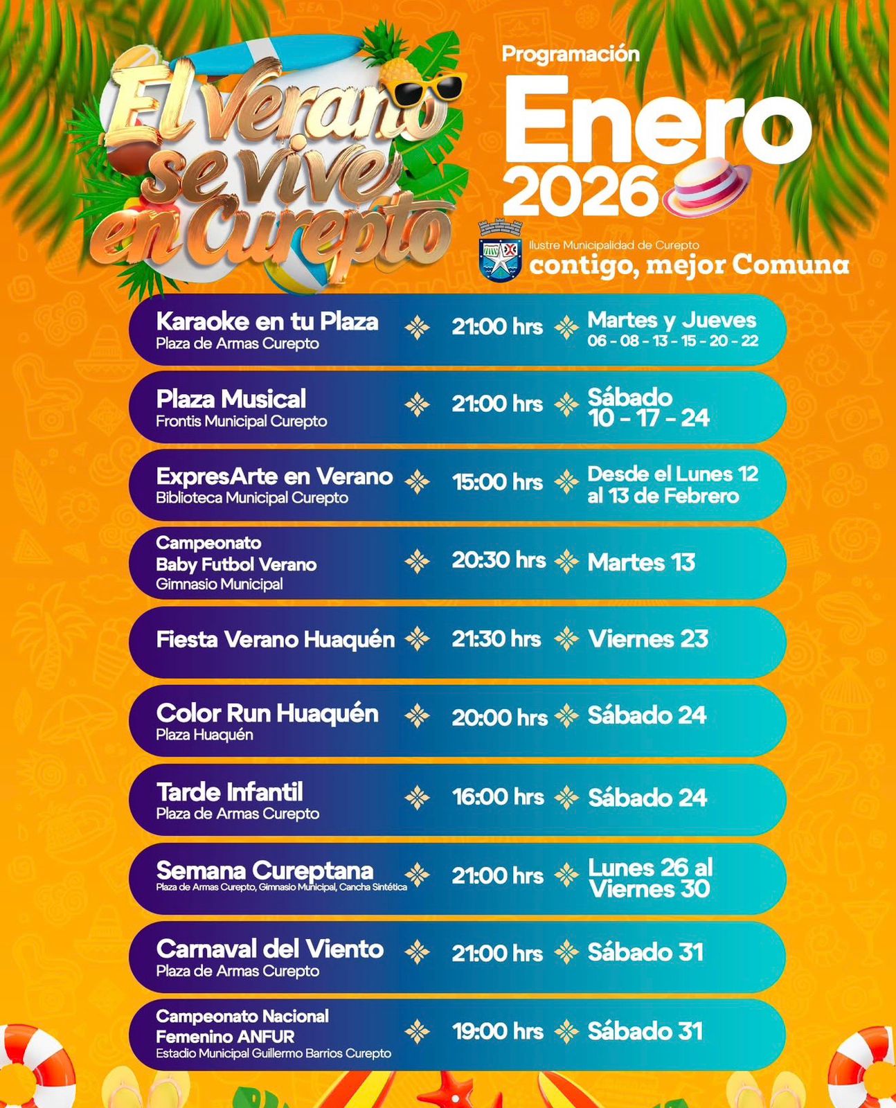 El alcalde de Curepto, Fernando Alcántara, valoró el esfuerzo por entregar una oferta de calidad y accesible para todos. "Hemos preparado una programación especial para enero, pensada para que nuestras familias puedan disfrutar el verano sin salir de la comuna, fortaleciendo la vida comunitaria, el deporte y la cultura, y llevando actividades a distintos sectores de Curepto", señaló el jefe comunal.