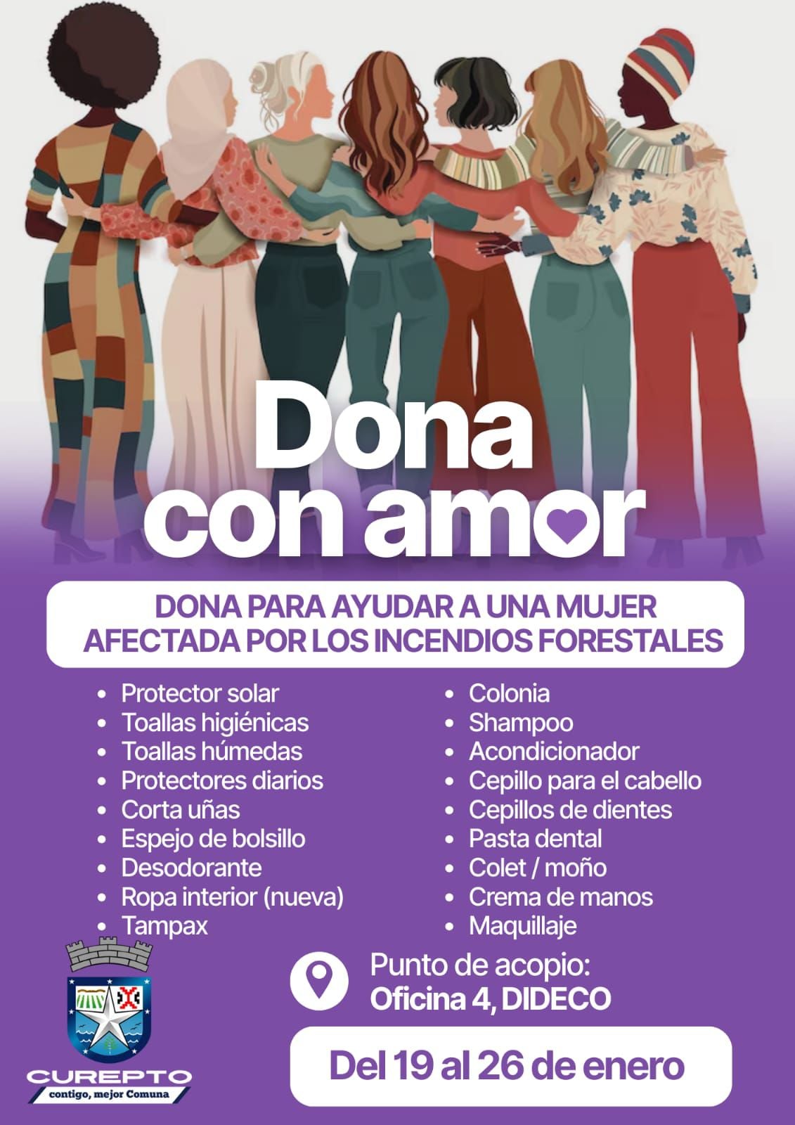 La comuna de Curepto activó una campaña solidaria destinada a apoyar a mujeres y jóvenes que han sido gravemente afectadas por los incendios en el sur de Chile. La iniciativa, impulsada de manera conjunta por la Municipalidad de Curepto, el programa Mujeres Jefas de Hogar y la Agrupación de Mujeres de Curepto, busca reunir insumos de higiene personal de primera necesidad para ser entregados directamente a las vecinas damnificadas.
