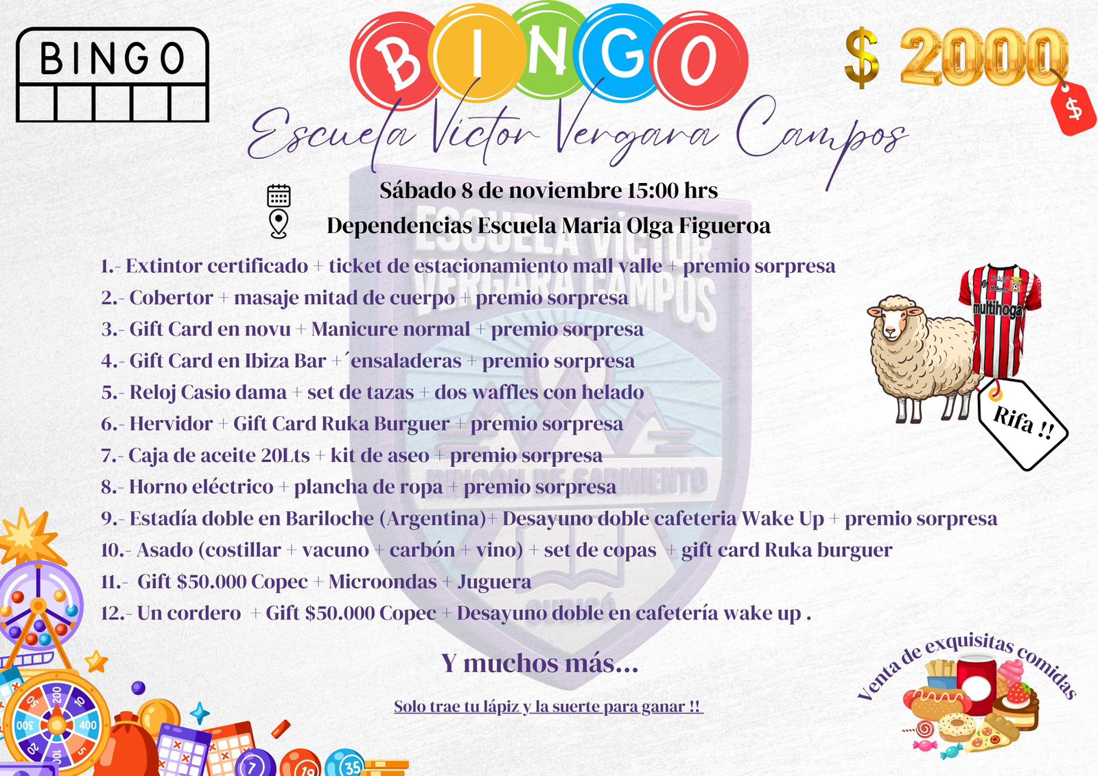 El valor de cada cartón de bingo es de $2.000. Habrá además venta de exquisitas comidas en el recinto. Los organizadores invitan a toda la comunidad a participar y colaborar con la causa de la escuela, solicitando a los asistentes llevar solo su lápiz y la suerte para ganar.