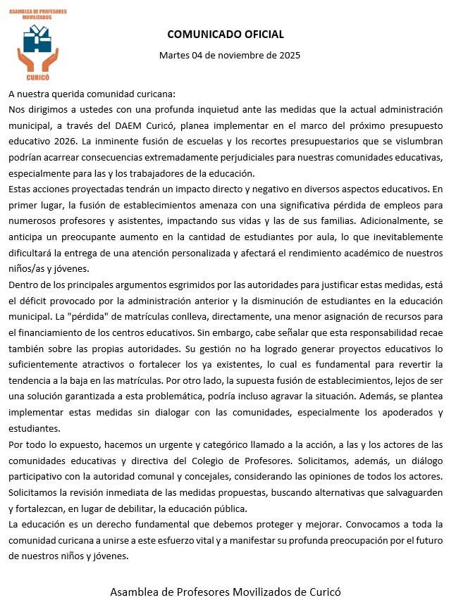 La Asamblea de Profesores Movilizados de Curicó emitió una declaración pública manifestando su "profunda inquietud" ante las medidas que el Departamento de Administración de Educación Municipal (DAEM) de Curicó planea implementar en el marco del presupuesto educativo de 2026.