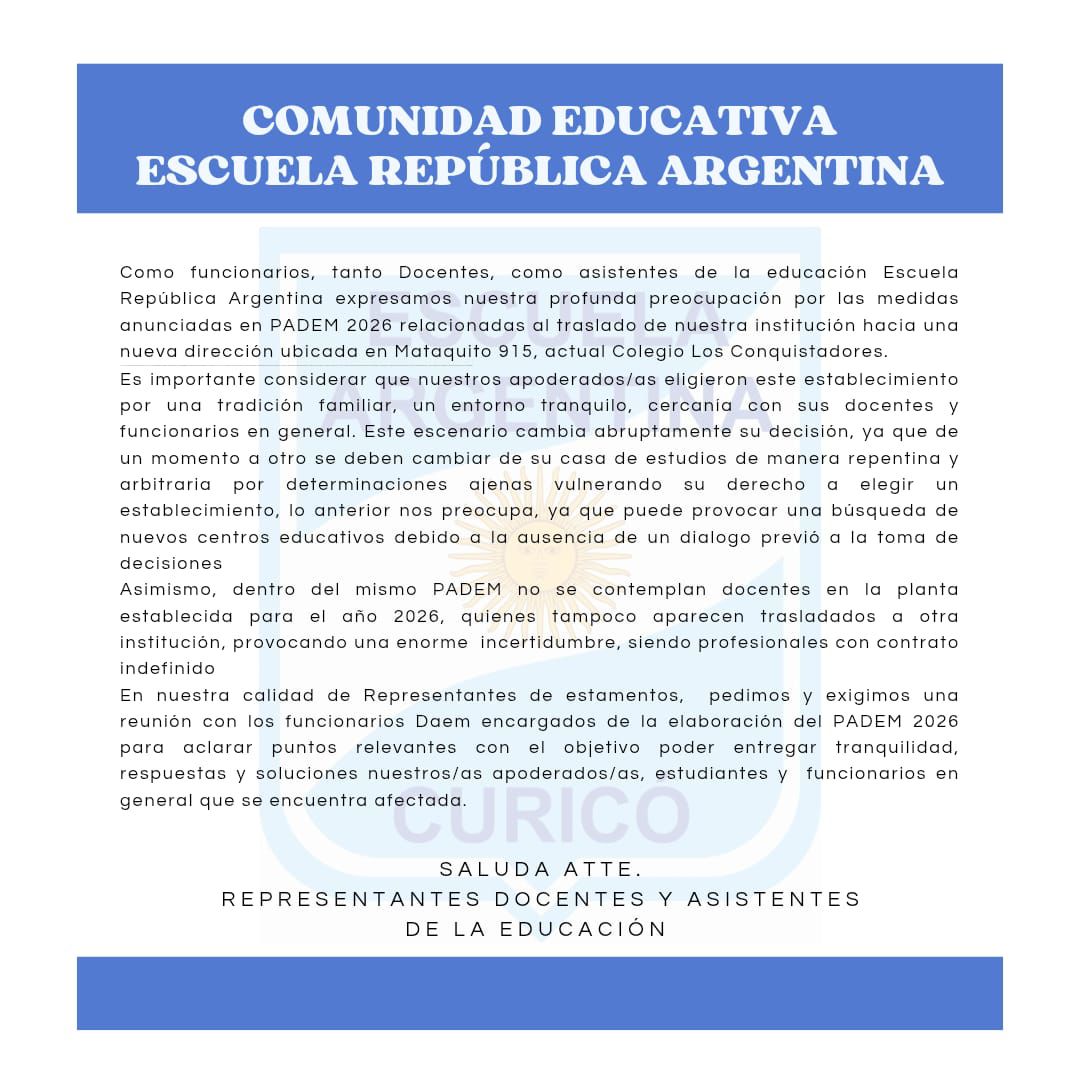 La comunidad educativa de la Escuela República Argentina ha emitido un comunicado expresando su "profunda preocupación" y rechazo a las medidas contempladas en el PADEM 2026 relacionadas con el traslado de su institución.