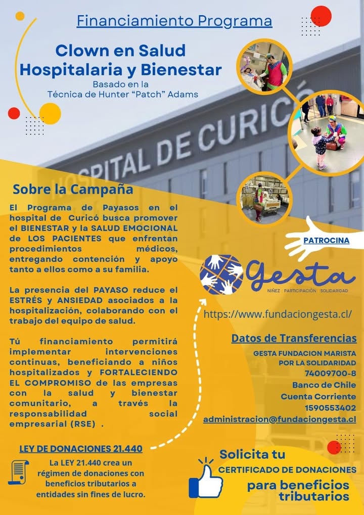 Lejos de la caricatura del payaso de circo, el Clown Hospitalario cumple un rol terapéutico profundo: ser un "bálsamo" emocional en medio del dolor y la incertidumbre clínica. Así lo define Marcelo Elías de Quiros Mariscal, actor profesional con 10 años de experiencia que, bajo el alero de la Fundación Gesta, lidera una cruzada para establecer este servicio de manera permanente en el Hospital Provincial de Curicó.