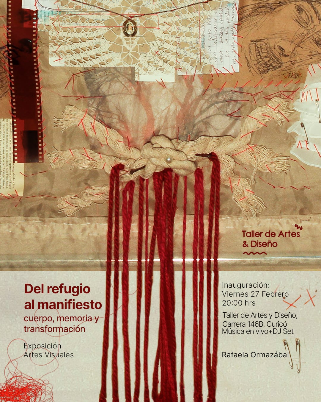 La agenda cultural de Curicó suma un nuevo panorama con la inauguración de la exposición de artes visuales "Del refugio al manifiesto: cuerpo, memoria y transformación". La obra, perteneciente a la creadora local Rafaela Ormazábal Canales, abrirá sus puertas a la comunidad este viernes 27 de febrero, a partir de las 20:00 horas, en las dependencias del Taller de Artes y Diseño, ubicado en calle Carrera 146B.