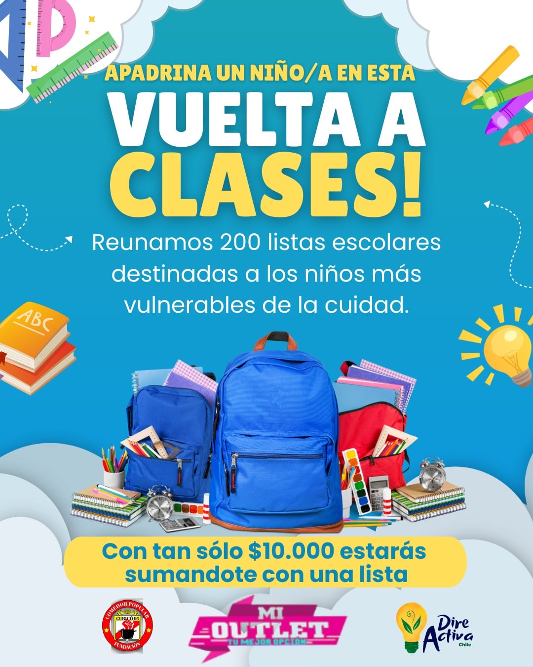 En alianza con la organización Dire Activa y la tienda Mi Outlet Curicó, buscan reunir 200 listas escolares para niños y niñas de escasos recursos, provenientes de diversos sectores de la ciudad, como Vaticano, Aguas Negras, Santa Fe y Manuel Rodríguez.