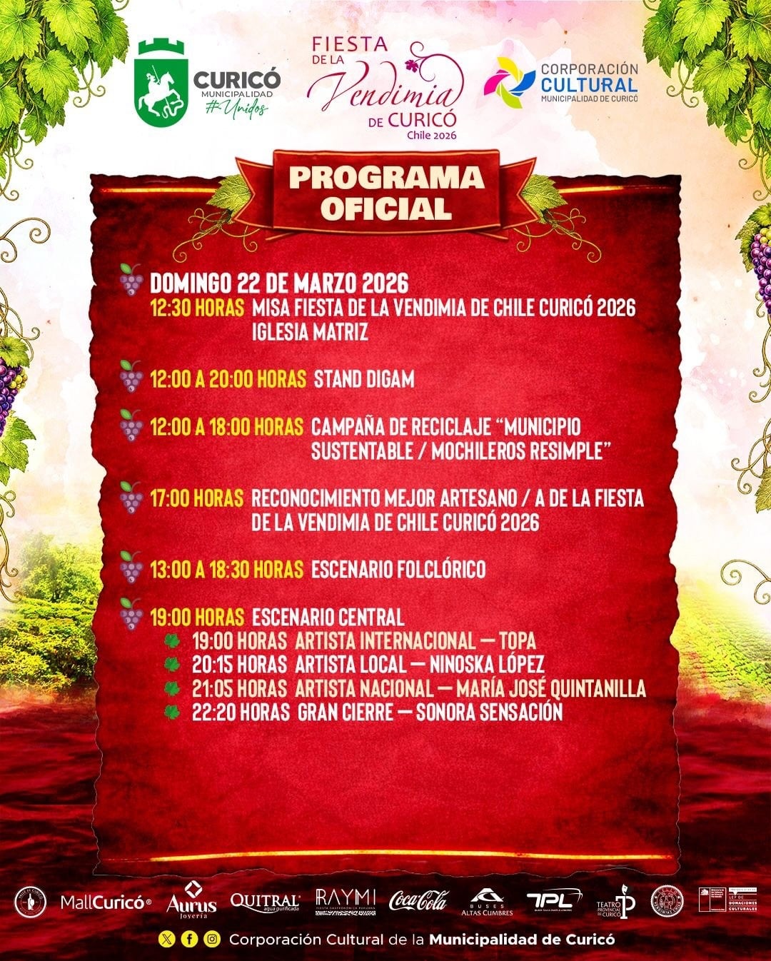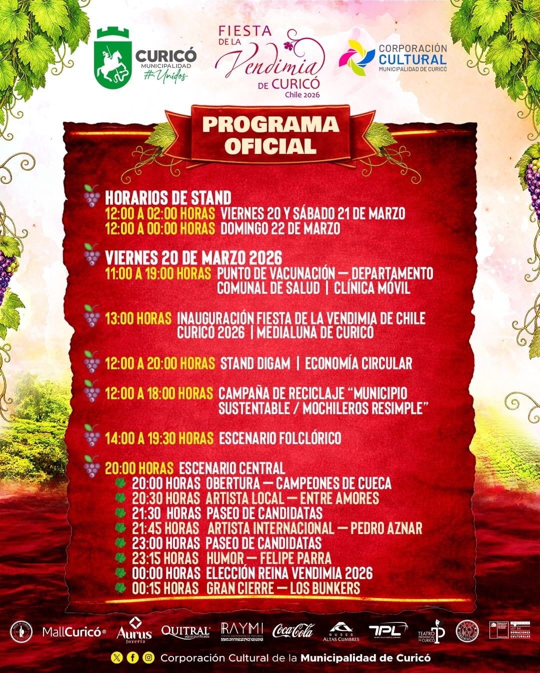La ciudad de Curicó afina los últimos detalles para vivir una nueva edición de su tradicional Fiesta de la Vendimia, programada para los días viernes 20, sábado 21 y domingo 22 de marzo de 2026. Durante las tres jornadas, los asistentes podrán disfrutar de los stands, los cuales funcionarán desde el mediodía y se extenderán hasta las dos de la madrugada el viernes y sábado, y hasta la medianoche en la jornada dominical. De manera paralela, la organización dispuso durante todo el fin de semana de operativos de economía circular a cargo de DIGAM, la campaña de reciclaje "Municipio Sustentable / Mochileros Resimple", además de un punto de vacunación mediante la Clínica Móvil de Salud.