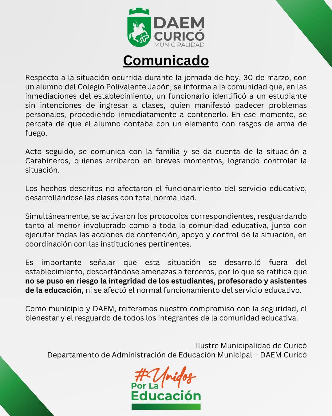 Tras el operativo policial generado en las afueras del Colegio Polivalente Japón de Curicó, luego de que un alumno intentara ingresar al establecimiento portando un arma de fuego, el Departamento de Educación Municipal (DAEM) entregó su versión oficial sobre los hechos y el manejo de la situación.