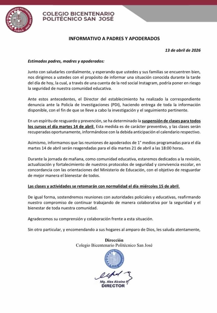 Un nuevo caso de alerta de seguridad escolar se registró en la comuna de Curicó, luego de que la dirección del Colegio Bicentenario Politécnico San José informara a sus apoderados sobre la "suspensión de clases para todos los cursos el día martes 14 de abril". La estricta medida de carácter preventivo fue adoptada de urgencia tras el hallazgo de mensajes alarmantes difundidos a través de plataformas digitales.