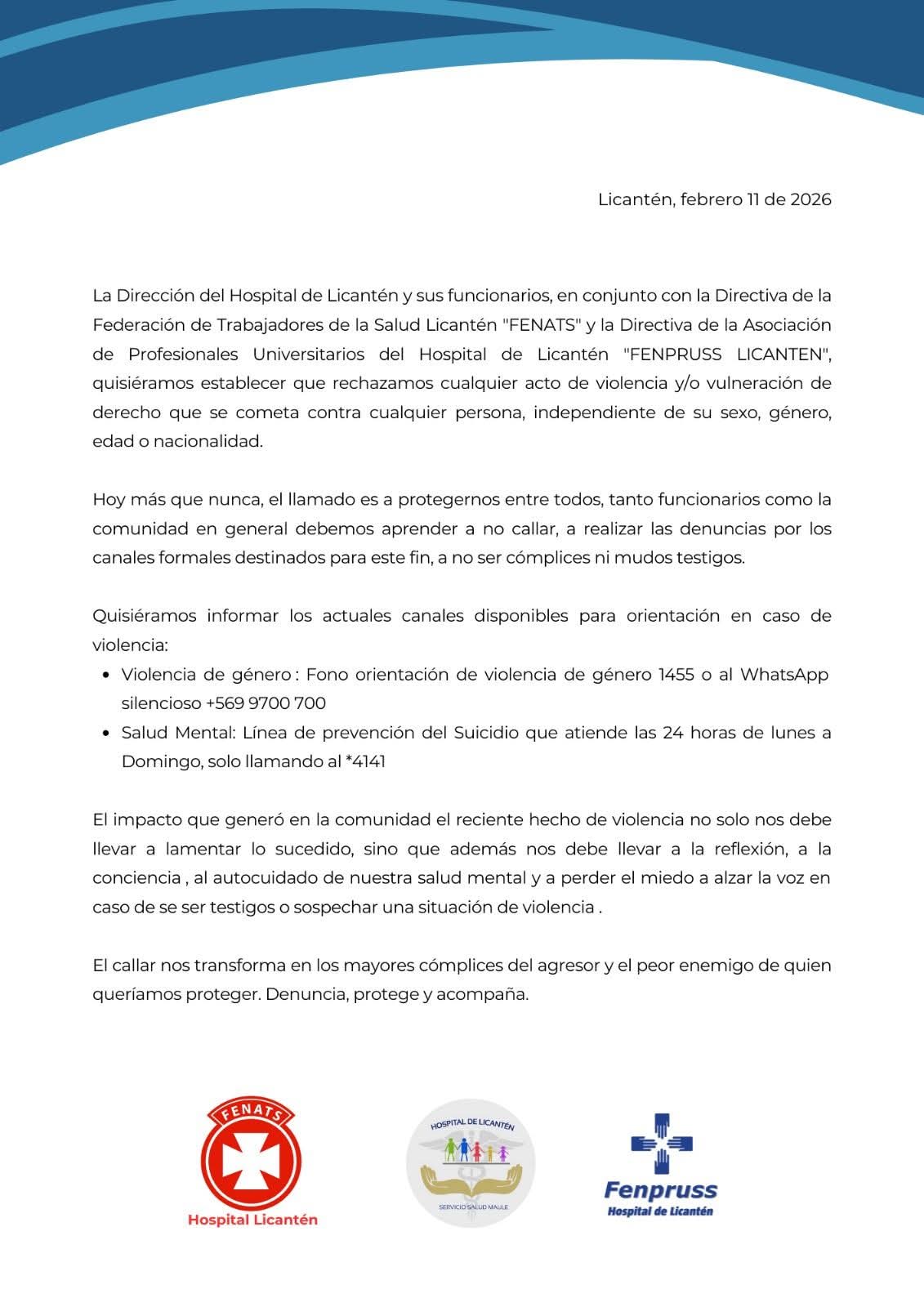 En una acción conjunta que busca marcar un precedente en la comunidad, la Dirección del Hospital de Licantén, junto a la Federación de Trabajadores de la Salud (FENATS) y la Asociación de Profesionales Universitarios (FENPRUSS), manifestaron este martes 11 de febrero su rechazo categórico a cualquier acto de vulneración de derechos.
