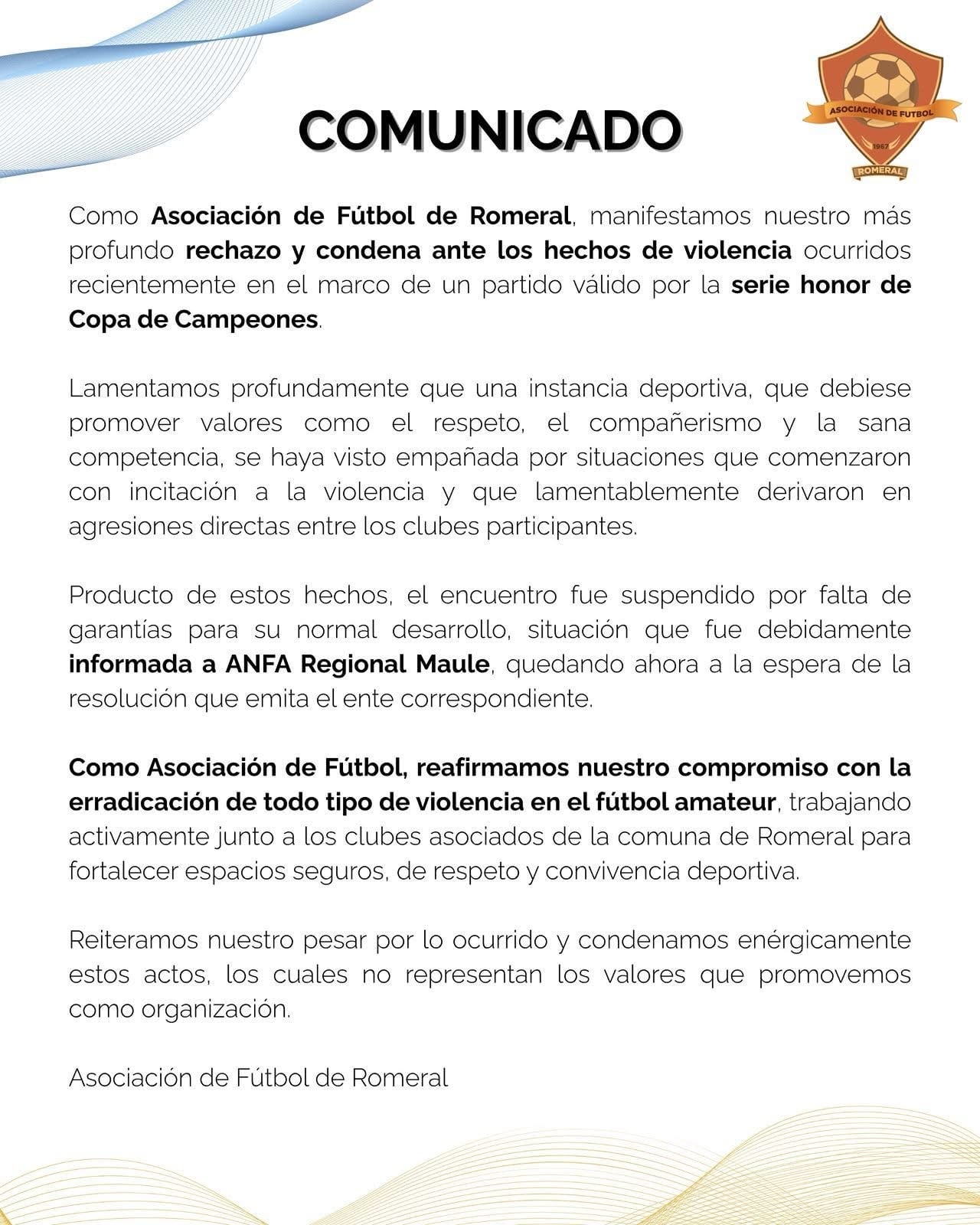 Finalmente, desde la Asociación de Fútbol de Romeral reafirmaron su compromiso con la erradicación de todo tipo de violencia en el deporte, lamentando profundamente que no se respetaran valores fundamentales como el compañerismo y la sana competencia. Asimismo, la organización recalcó que continuará trabajando de manera activa junto a los clubes asociados para fortalecer la creación de espacios seguros, de respeto y de buena convivencia deportiva.