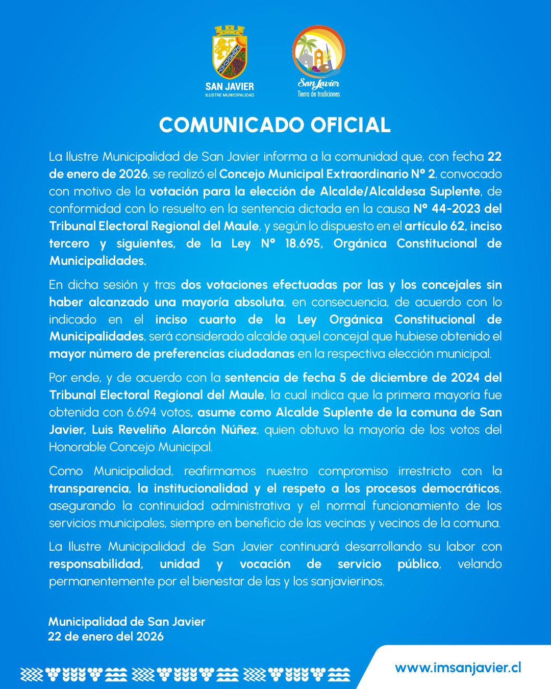 Si bien Alarcón asume la suplencia, la teleserie política de San Javier aún tiene capítulos pendientes. El destituido exalcalde, Jorge Silva, apeló al Tribunal Calificador de Elecciones (Tricel) intentando revertir el fallo de primera instancia. Hasta la fecha, no se conoce la resolución final del organismo, por lo que Alarcón liderará la comuna mientras se terminan de zanjar estos aspectos legales.