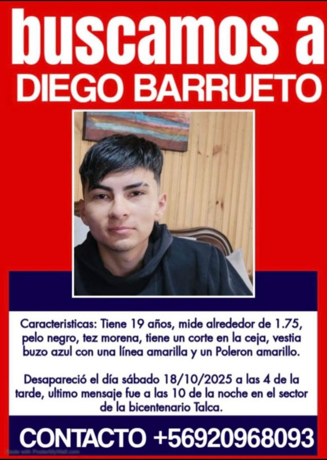Diego Barrueto se encuentra extraviado desde la noche del sábado, luego de ser visto por última vez en el sector Bicentenario de la capital maulina, cuando se dirigía a su domicilio.