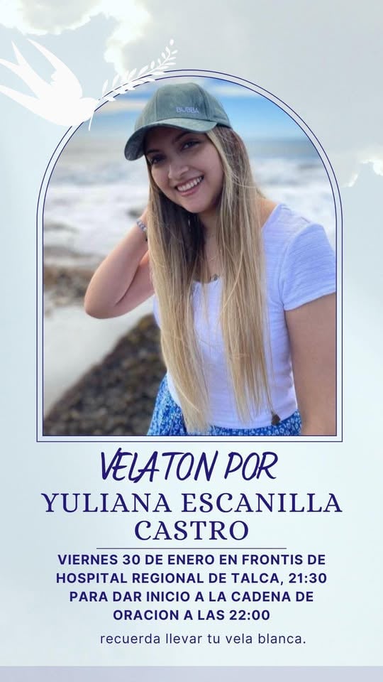 Las comunidades de Curepto y Talca se preparan para unirse en una jornada de fe y solidaridad en apoyo a Yuliana Escanilla Castro. La familia y la pareja de la joven de 25 años han organizado una velatón para la noche de este viernes 30 de enero, con el objetivo de enviar fuerzas y oraciones para su pronta recuperación mientras permanece internada en la Unidad de Cuidados Intensivos (UCI).
