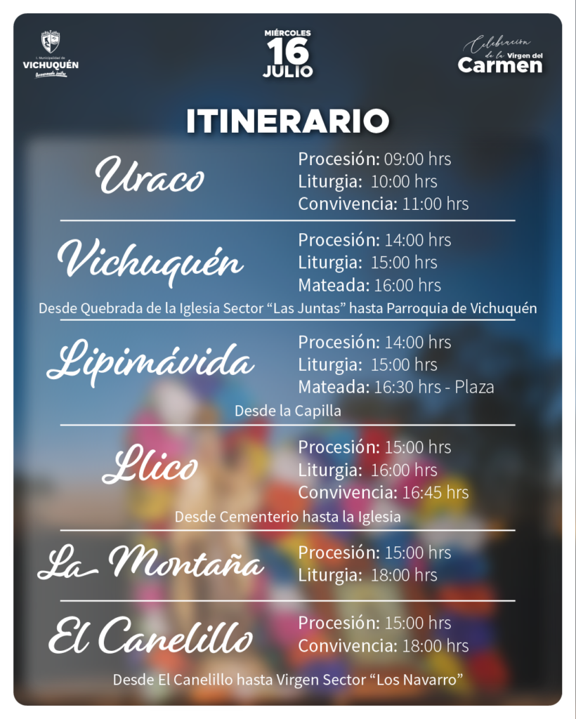 Este miércoles 16 de julio se realizará la Celebración de la Virgen del Carmen, evento religioso que en la comuna de Vichuquén reunirá a la comunidad alrededor de diversas actividades.