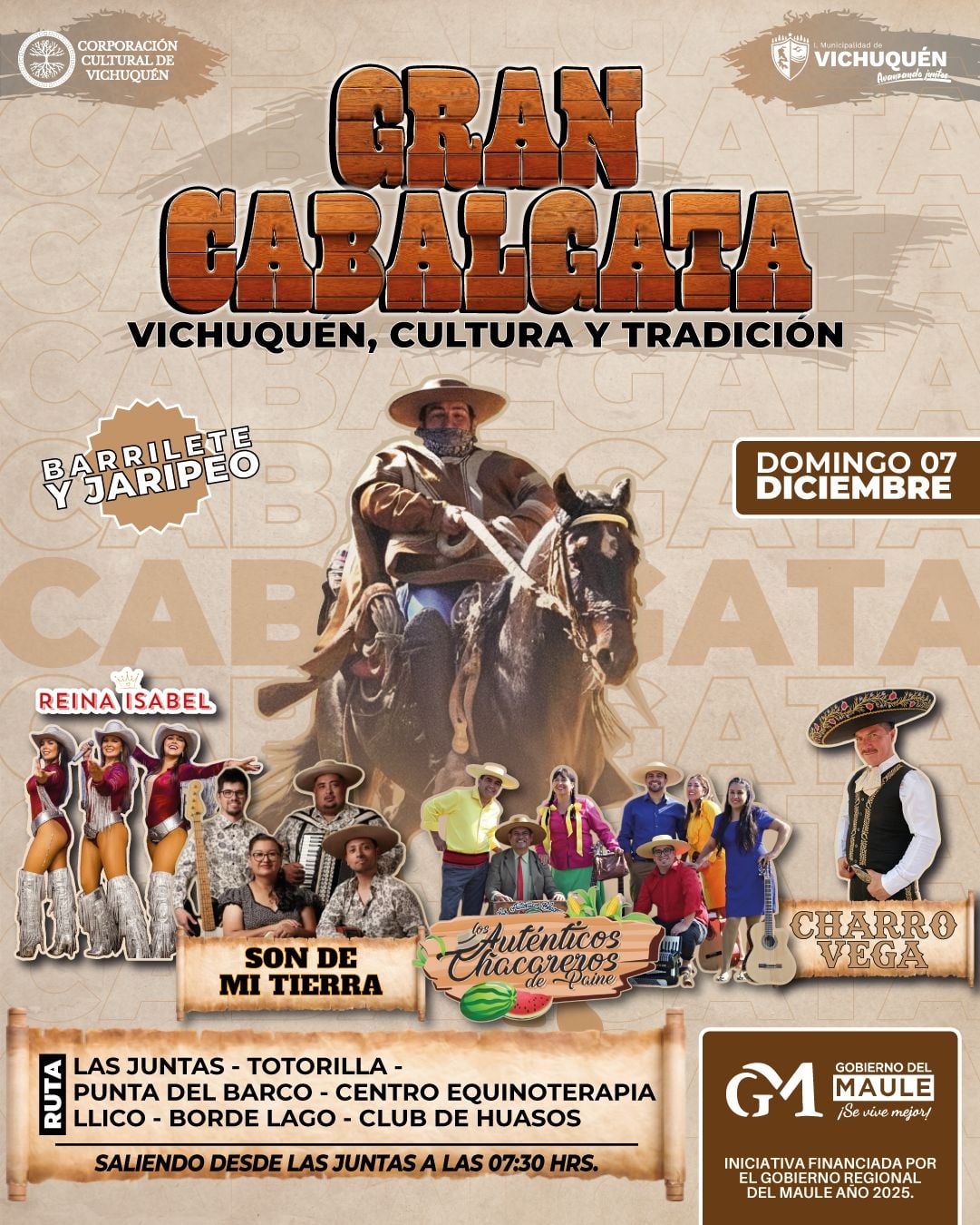La Municipalidad de Vichuquén, el Gobierno Regional del Maule y la Corporación Cultural de Vichuquén invitan a la comunidad a participar en la Gran Cabalgata "Rescatando Tradiciones", una jornada inolvidable para celebrar el folclore y las costumbres locales.