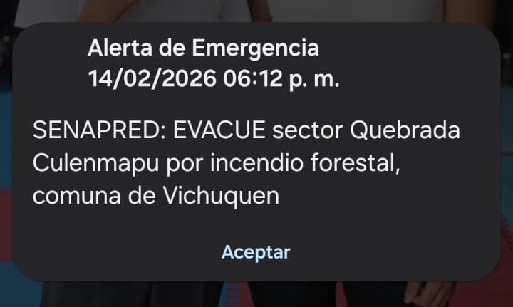 La emergencia forestal que afecta a la zona costera de la provincia de Curicó ha escalado en peligrosidad durante la tarde de este sábado. El Servicio Nacional de Prevención y Respuesta ante Desastres (SENAPRED) activó el Sistema de Alerta de Emergencia (SAE) para los teléfonos móviles ubicados en la comuna de Vichuquén.