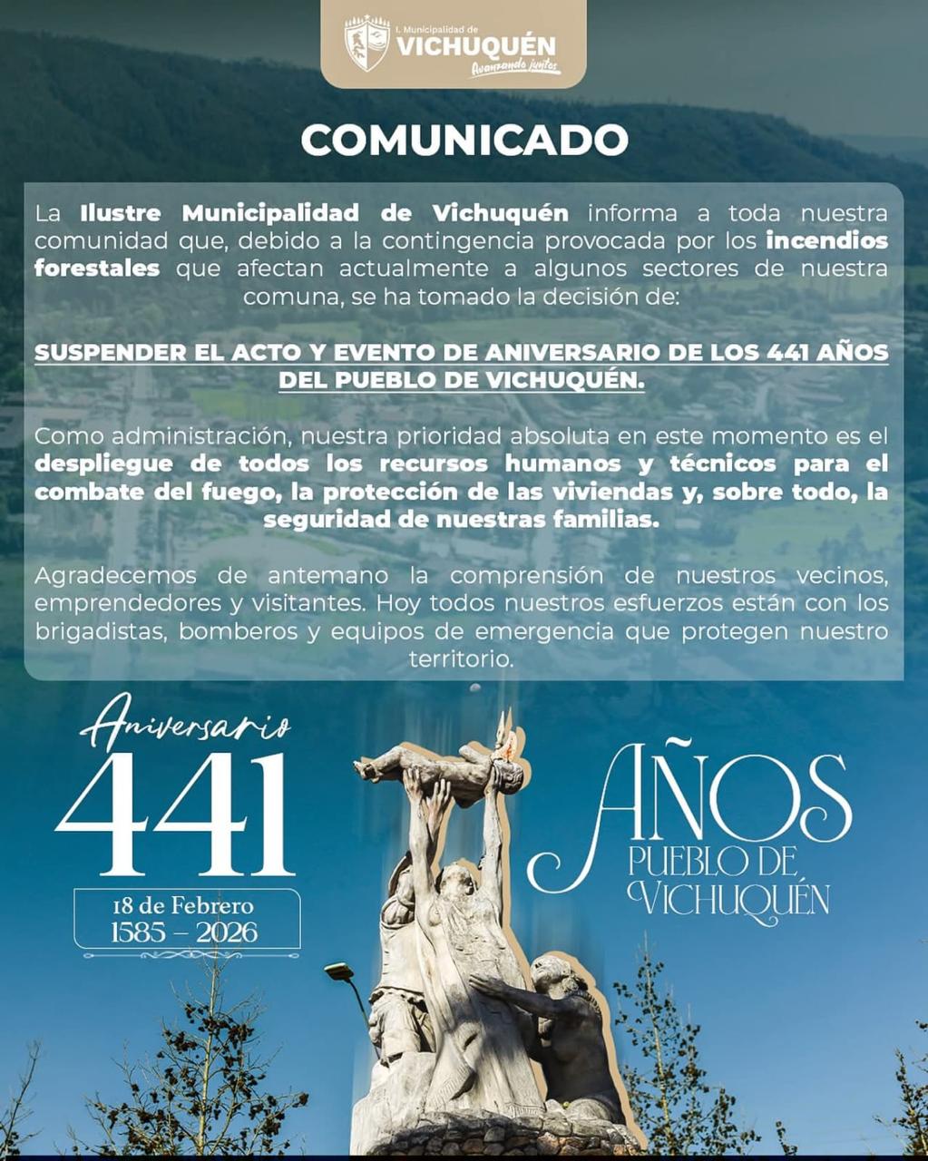 La fecha conmemorativa estaba fijada para este 18 de febrero, marcando los 441 años de historia de la localidad (1585-2026). Sin embargo, las autoridades estimaron que no están las condiciones para realizar festejos mientras los equipos de emergencia, brigadistas y bomberos luchan por controlar la situación en el territorio.