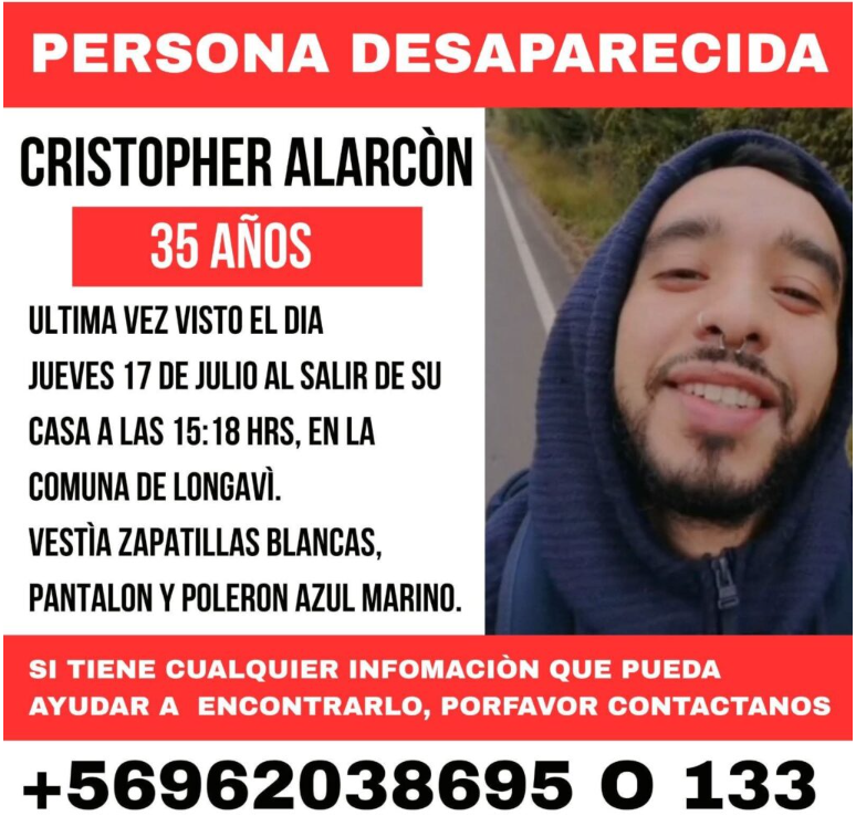 Hace una semana que se desconoce el paradero del joven Cristopher Alarcón, padre de 35 años, oriundo de Longaví. El hombre de profesión TENS, desapareció el pasado jueves 17 de julio, mientras se dirigía a una reunión de apoderados. De acuerdo a la madre de Cristopher, Jenny Quirilao Farias, el joven salió de su casa en Longaví a eso de las 15:18 horas de la tarde, con un permiso administrativo en su trabajo.