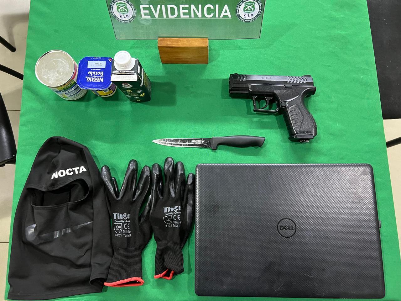 En el procedimiento se logró la captura de una pareja de jóvenes, ambos mayores de edad y sin antecedentes penales previos, quienes pasaron a control de detención ante el Juzgado de Garantía de Curicó por el delito de robo con violencia e intimidación. Al revisar el vehículo en el que se desplazaban, Carabineros recuperó parte del botín, que incluía un computador personal, y levantó evidencias claves como un arma tipo pistola, un cuchillo, pasamontañas y guantes utilizados en el atraco.