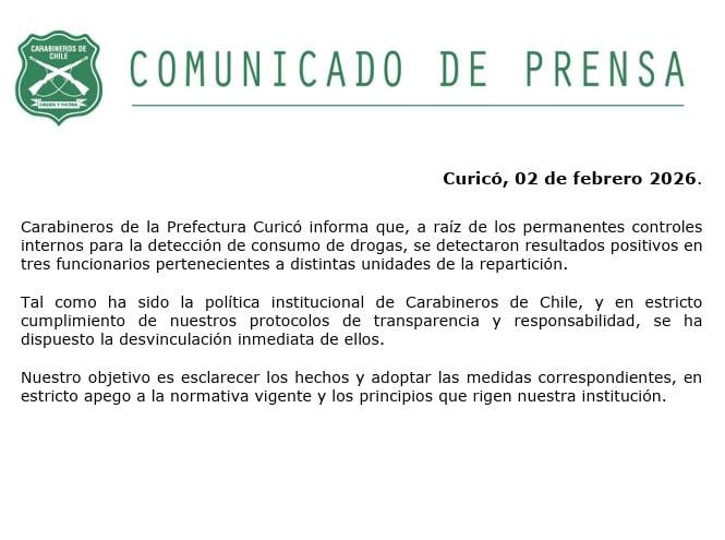 La Prefectura de Carabineros de Curicó confirmó oficialmente, a través de un comunicado de prensa emitido este lunes 2 de febrero de 2026, la desvinculación de tres funcionarios de sus filas tras detectarse el consumo de sustancias ilícitas. La declaración valida los antecedentes revelados previamente por VLN Radio, respecto a los resultados que arrojaron los mecanismos de fiscalización interna de la policía uniformada en la provincia.