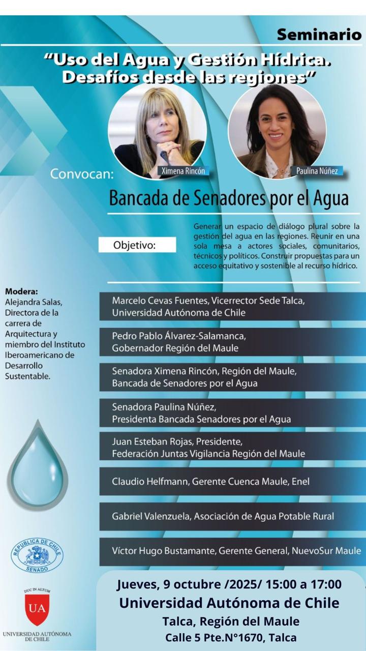 Con el objetivo de articular propuestas concretas para un acceso equitativo y sostenible del recurso hídrico, la Bancada de Senadores por el Agua realizará un seminario clave el jueves 10 de octubre desde las 15:00 horas en la sede Talca de la Universidad Autónoma de Chile.